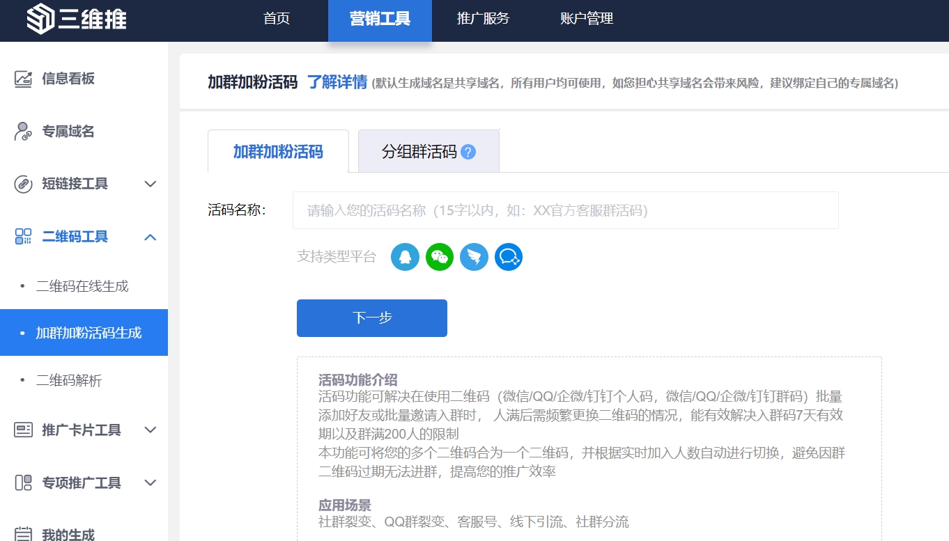 社群运营者则能借助其加群活码功能突破流量瓶颈。三维推支持绑定 200 个群码或个人码,当某个二维码达到访问上限或临近 7 天有效期时,系统会自动切换至下一个有效二维码,真正实现 "一码永久引流"。运营者在后台即可实时监控扫码数据,精准掌握用户来源地区与访问高峰,让社群引流更具针对性。