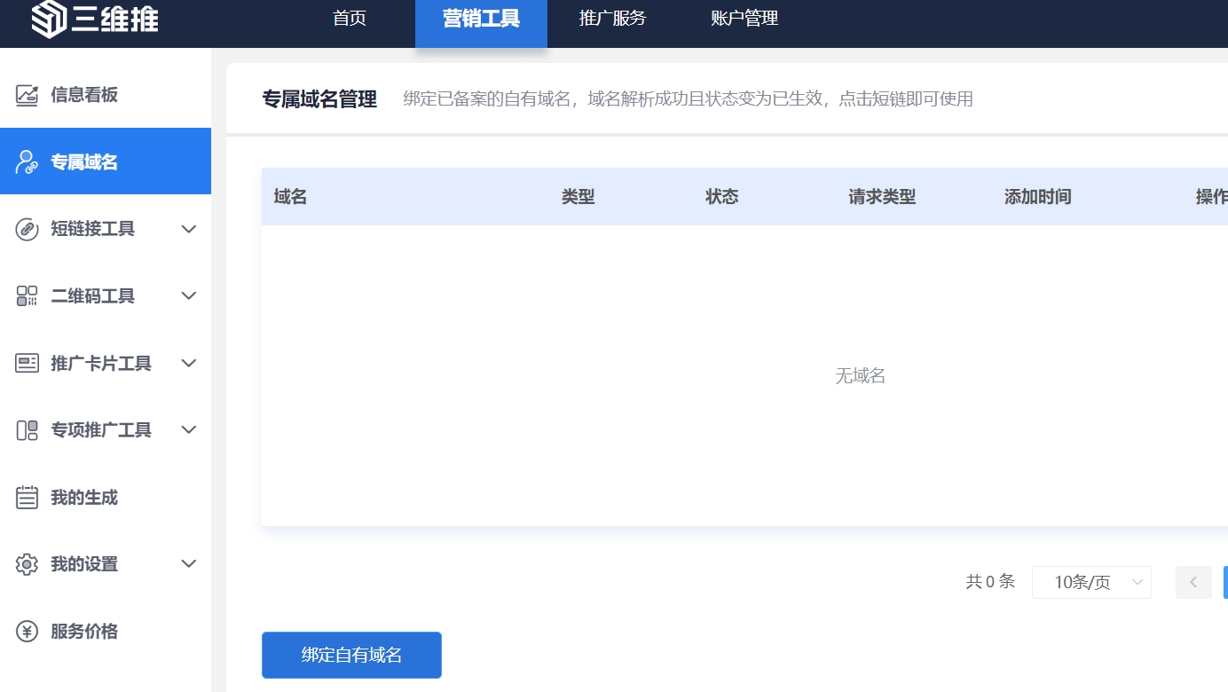 需要特别提醒的是,三维推默认使用共享域名生成活码,共享域名就是所有三维推用户都可以用的域名,如果有用户使用共享域名生成活码去违规使用,就可能导致该域名被微信封禁,那么,使用该共享域名的生成活码,都可能出现无法查看的情况。因此,想要避免被牵连,建议您优先使用自己的域名生成活码,可以在【专属域名】绑定您自己的域名来生成加群加粉活码。